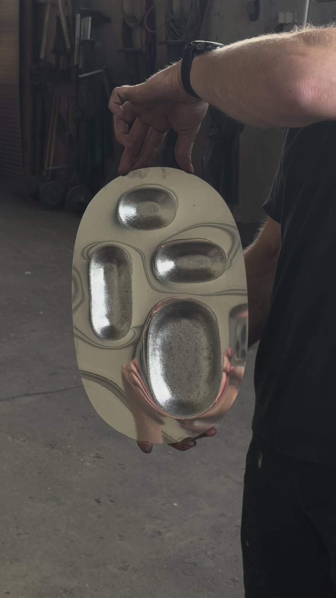 Part of the Hammered Scapes series by Gerlach & Heilig, this stainless steel tray is shaped using a self-developed compressed air hammering process, traditionally used for harder metals, reinterpreting classic metalwork with a contemporary edge. Each tray carries a raw, tactile texture that makes it unique, perfect for holding keys, jewellery, or serving small bites.